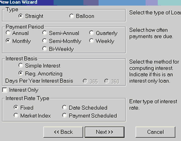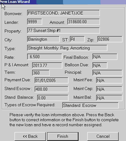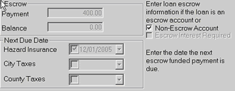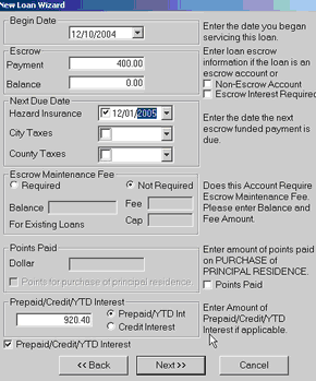 19. Click NEXT 20. You will see a dialog box where you can add another co-borrower or guarantor 21. Click NEXT 22. Fill in the appraisal and collateral information click Next (You can use any thing you are using as collateral such as Auto, ATV, savings, CD, and is not limited to real estate, or leave it blank) 23. Click NEXT 24. Complete the Late Fee Requirements and Service Fee needs of the note (optional) 25. Click NEXT 26. Complete the Pre Payment Penalty and Past Due Fee information (optional) 27. Click NEXT 28. Click NON-ESCROW ACCOUNT (Begin Date is the date you begin servicing this note)