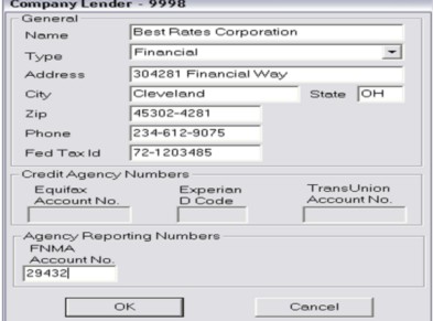 1. From the Main Screen, click Review>Lender>New The program will now ask you if the lender is a Company or Not 2. Make your selection and click OK The next screen, seen below, will need to be completed. In the middle of this screen you will see a section listed "Credit Agency IDs". This is this lender's credit reporting ID that is used when creating a credit-reporting agency file. At the bottom of the screen you will see a section listed "Agency Reporting Numbers". This is the lenders Agency number with Fannie Mae. 3. After you are finished inputting the information click OK